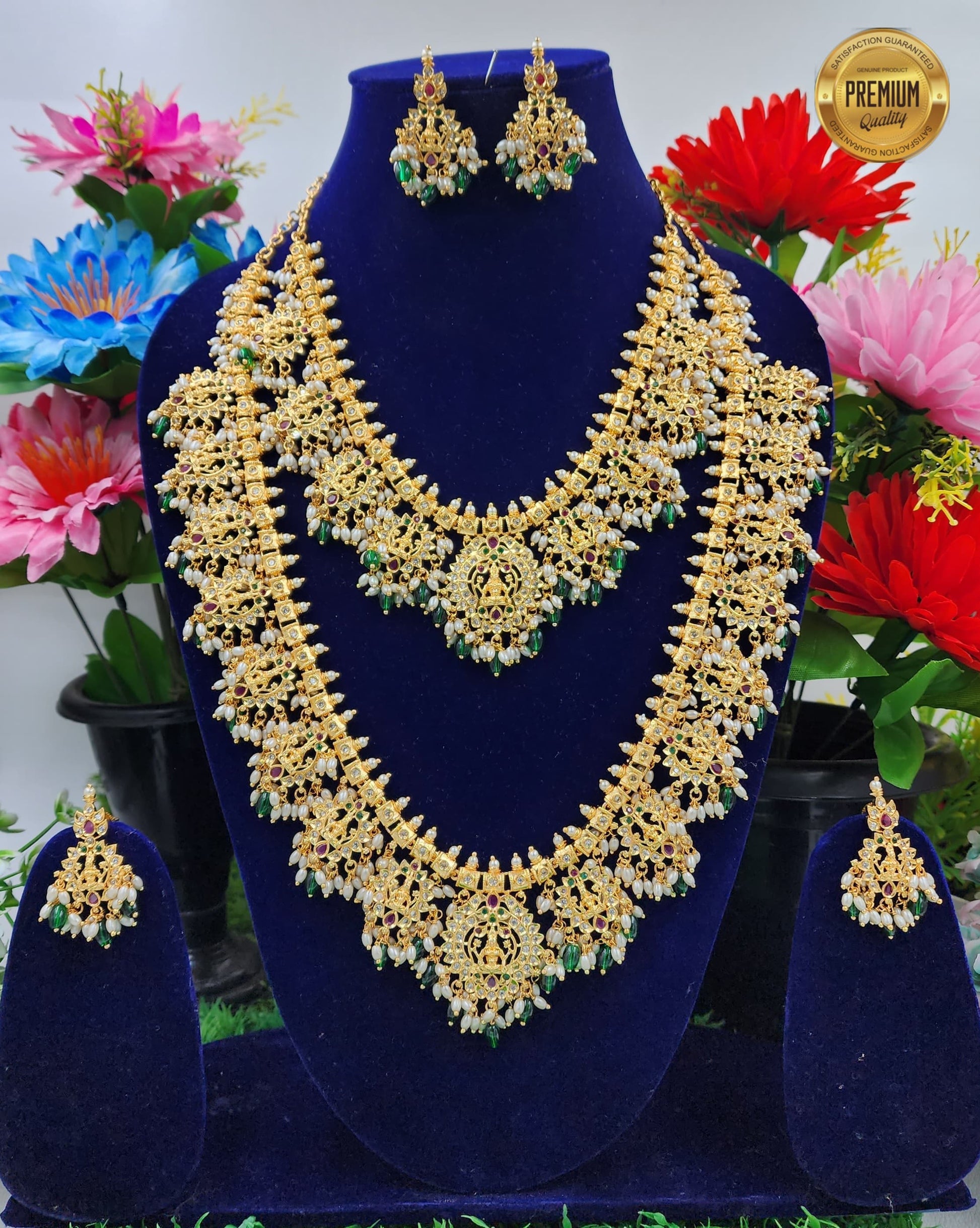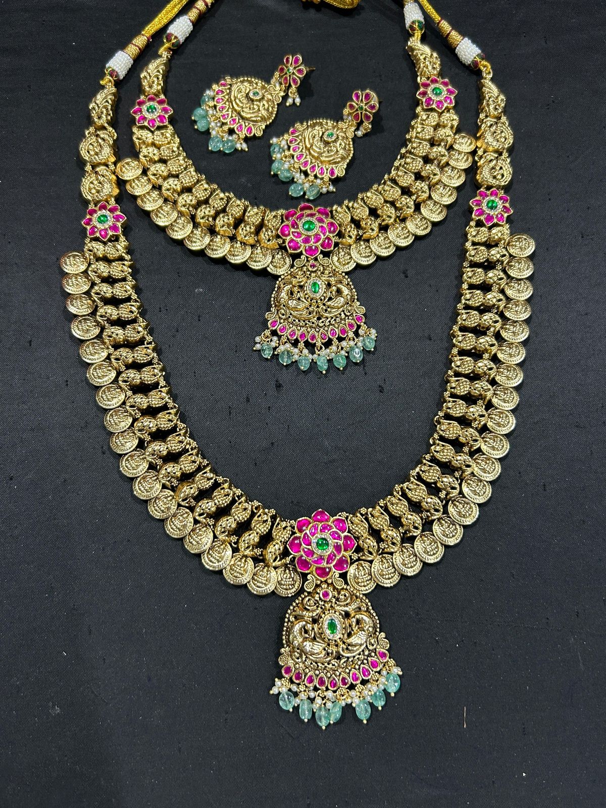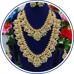 The Guttapusalu combo features traditional South Indian gold bead jewelry renowned for its intricate design and cultural significance. Expertly crafted, this combo combines elegance and craftsmanship to enhance any festive or bridal look. Its detailed construction ensures lasting beauty, making it a valuable addition to your collection of heritage-inspired accessories. Perfect for those seeking authentic temple jewelry with a timeless appeal.